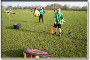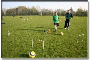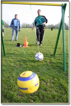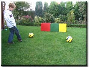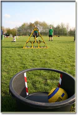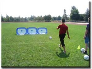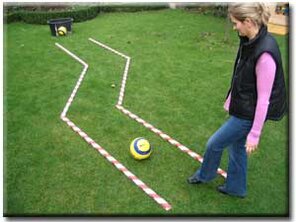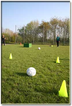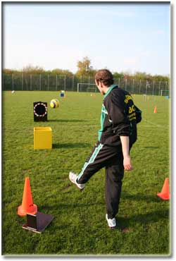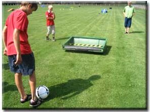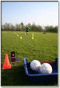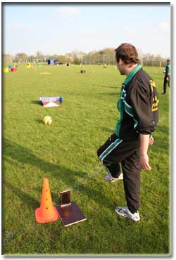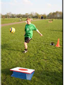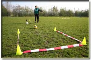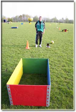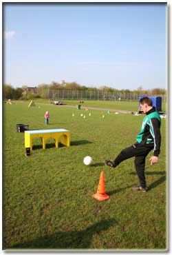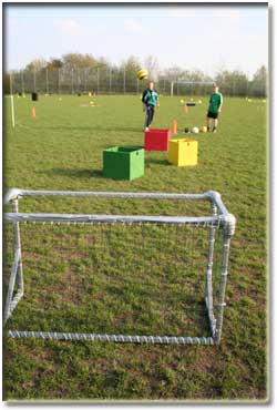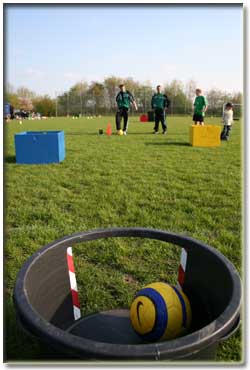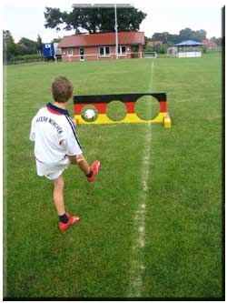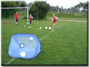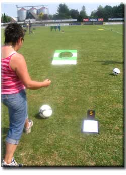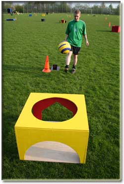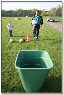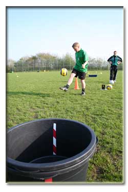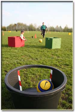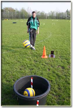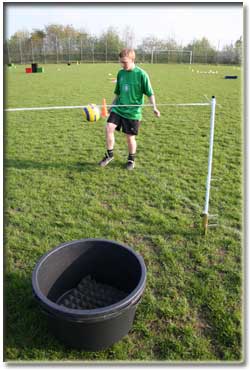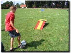 Der Spieler stellt sich neben den Zielbehälter und spielt den Ball (aus der Luft) mit dem ersten Fußkontakt direkt in den Behälter