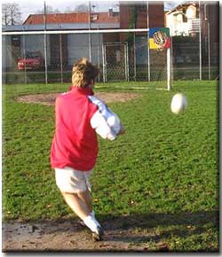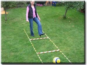 Der Spieler legt den Ball auf die 5er Linie im 16er und versucht den Ball vom Boden mit der Fußspitze über die Plane zu heben.